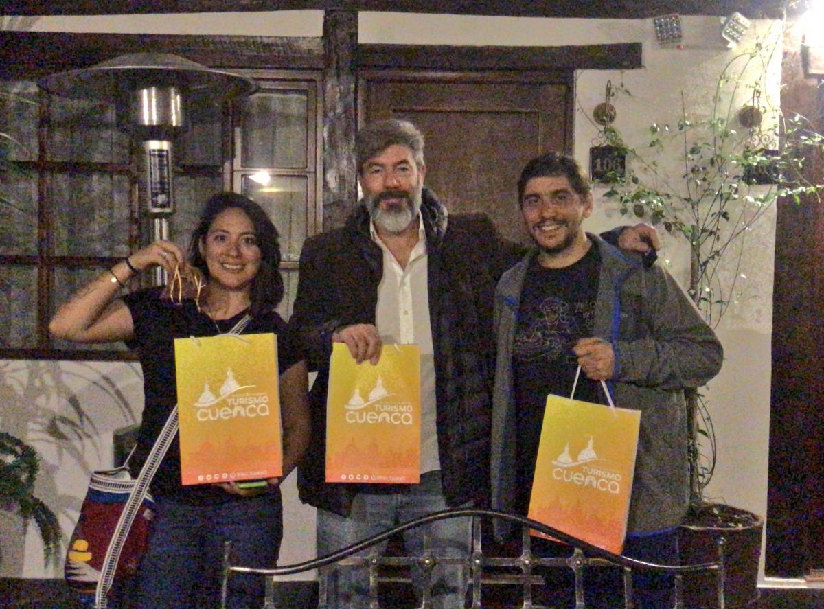Andrés Dubrosky representando a INTRIPER, Liliana Estrada representando a CULTURA COLECTIVA y Ernesto Santamaría representando a LA BIOGUÍA luego de disfrutar a la ciudad de Quito por 4 días llegaron a la ciudad de Cuenca la noche de un miércoles con un cielo lleno de estrellas.